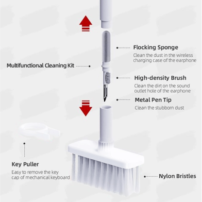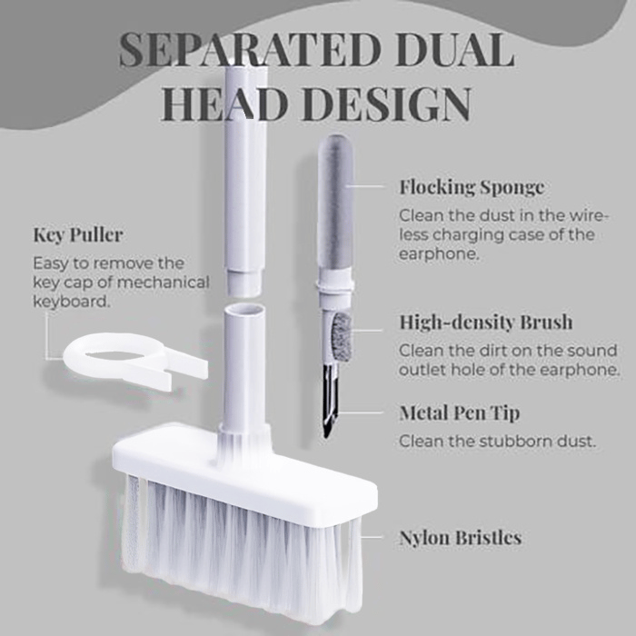5-in-1 computer cleaning kit with Nylon Bristles, Flocking Sponge, High-density Brush, Metal Pen Tip and Keycap Puller, dual head is hidden design to meet a variety of cleaning needs.